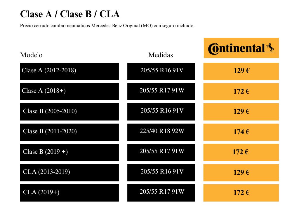 Precios por unidad válidos hasta el 31 de Marzo de 2026. Incluyen equilibrado, contrapeso, inflado, SIGNUS, impuestos y Seguro de Neumáticos Turismos Mercedes-Benz* según lo indicado en las condiciones generales. Consulta con tu Taller Autorizado si esta adherido a esta promoción. Seguro ofrecido por Real Garant Versicherung AG a través de Mercedes-Benz Services, Correduría de Seguros, S.A.U. inscrita en el Registro Especial de la DGSFP. Con el Seguro Gratuito de Neumáticos Turismos Mercedes-Benz, en caso de pinchazo, rotura/deformación accidental o reventón, el seguro de Mercedes-Benz se hará cargo de la sustitución del neumático asegurado por uno nuevo, incluyendo los gastos de montaje. Además, como un imprevisto siempre es algo incierto, nuestro seguro te cubrirá también la sustitución del segundo neumático del mismo eje.